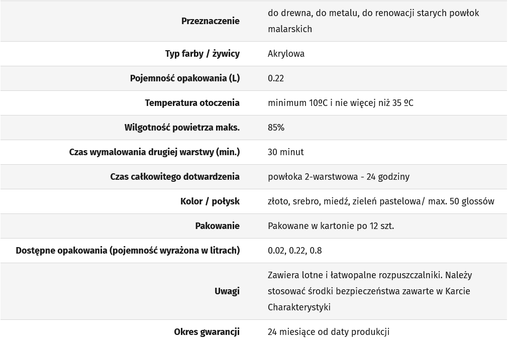 Efekt dekoracyjnej patyny – nadaje powierzchniom metaliczną, stylową powłokę w odcieniach złota, srebra, miedzi czy zieleni pastelowej.